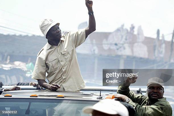 LAGOS, NIGERIA: The president of the Nigeria Labour Congress, Adams Oshiomhole (L), waves to the crowd 03 October 2004 during a rally by the workers' union in Lagos. The union has began mobilizing the public to ensure success for the planned 16 November 2004 general strike against the continuous rise of fuel prices in the country. AFP PHOTO (Photo credit should read -/AFP via Getty Images)